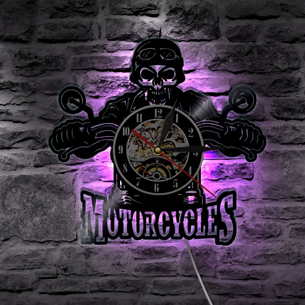 Cette Horloge Murale Tête de Mort dispose sur option d’un éclairage LED multicolore contrôlé par télécommande.